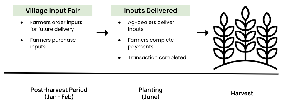 Input dealers deliver ag inputs at the onset of planting season, farmers pay the remaining 90%, and market is cleared